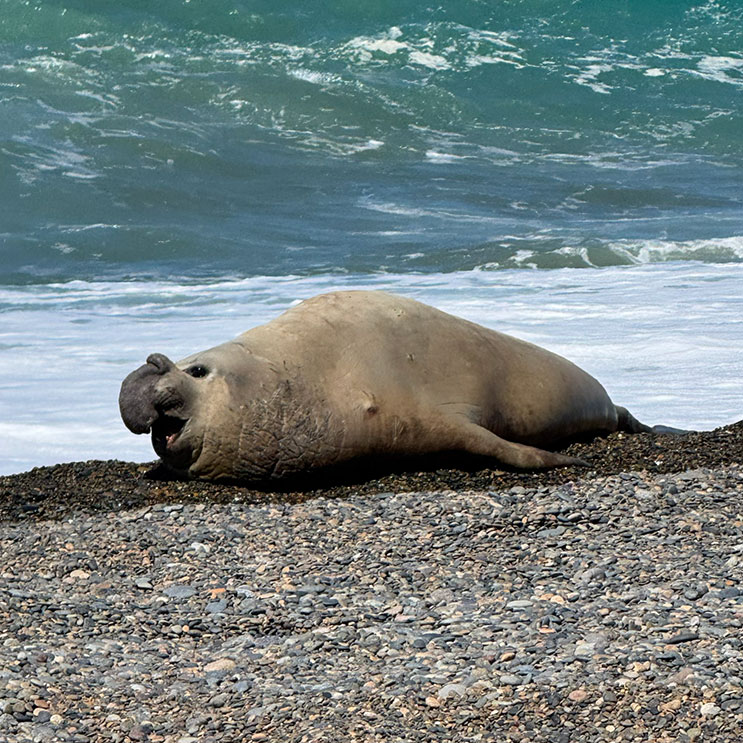 Die anschliessende Übernachtung auf der kleinen, familiären Estancia La Elvira ist ein besonderer Höhepunkt. Zusammen mit einem Ranger erreichen wir über einen kurzen Pfad den privaten Strand der Estancia. Dort erleben wir Seeelefanten und Seelöwen aus nächster Nähe. Als zwei mächtige Seeelefantenbullen nur wenige Meter vor uns in ein eindrucksvolles Kräfteringen geraten, stockt uns der Atem. Und als wir später sogar Orcas entdecken, können wir unser Glück kaum fassen – solche Begegnungen sind äusserst selten.