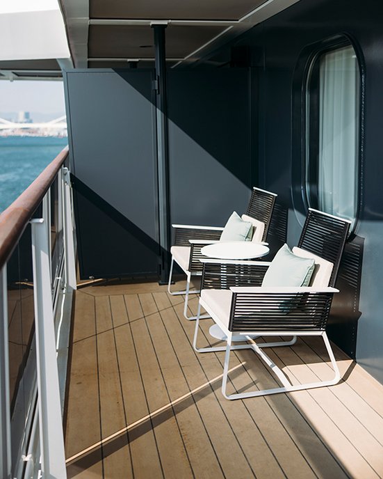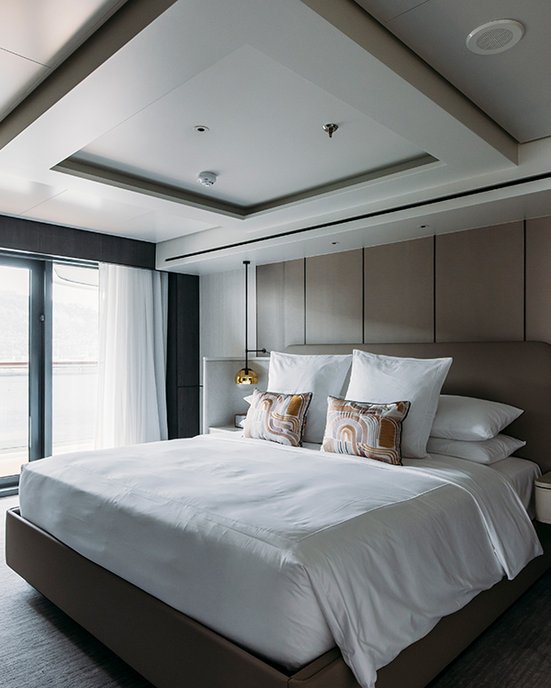 Die kleinsten Suiten starten bei 27m² und verfügen über einen Balkon und eine bequeme Wohn-Sitzecke. In meiner Terrace-Suite erwartet mich zur Begrüssung eine Flasche Champagner. Begeistert bin ich von der Mini-Bar, die mit einer Kaffeemaschine und einem Teekocher von Krups ausgestaet ist. Porzellantassen und eine Auswahl von gekühlten Softdrinks stehen neben feinen Snacks bereit. Im Kleiderschrank finde ich einen Dyson-Föhn, ein Schuhputz-Set im Lederköfferchen und eine bequeme Decke von der italienischen Marke Free (ebenfalls im eleganten Lederkoffer) vor. Kuschelige Bademäntel, Badeslipper und Pegeprodukte von der Marke Diptyque aus Paris sorgen für erfrischende Momente. Generell erinnert die Ausstattung und der Platz an ein Hotelzimmer, insbesondere im Badbereich. Den grössten Anteil machen die Signature Suiten mit 38m² aus, in den Grand Suites wohnen Sie auf 52m². In den insgesamt 8 Owner-Suiten an Bord benden sich auf der weitläugen Terrasse jeweils ein privater Outdoor-Whirlpool und eine Aussendusche. Die Concierge-Suiten sind ein paar wenige Quadratmeter kleiner und liegen mittig im hinteren Bereich des Schiffs.