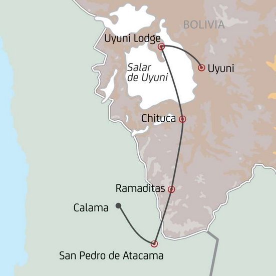 Im Fahrzeug, auf Wanderungen oder mit dem Bike entdecken Sie die eigenwillige Schönheit und Weite dieser aussergewöhnlichen Region. Erklimmen Sie die vielfarbigen Hänge des Vulkans bis auf eine Höhe von 5400 m, besuchen Sie die mit Kakteen überwachsenen Inseln im Salzsee und entdecken Sie die wenigen kleinen Ortschaften am Ufer des Salars.