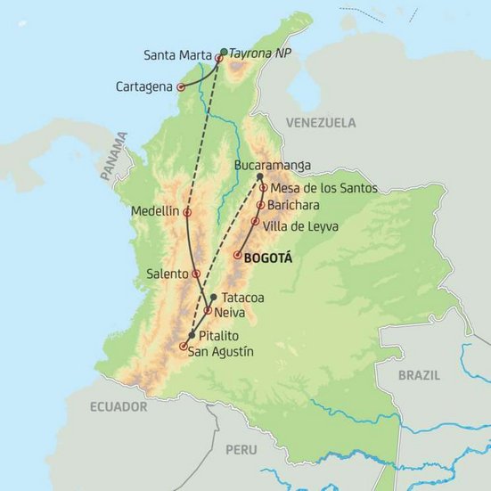 Fahrt zum Flughafen Medellin und Flug nach Santa Marta. Die wichtige Hafenstadt am Fuss der Sierra Nevada de Santa Marta, dem höchsten Küstengebirge der Welt, ist Ausgangspunkt für Ausflüge in den Tayrona-Nationalpark. Ihr Hotel befindet sich nach Wahl am Strand oder in der kleinen, restaurierten Altstadt.