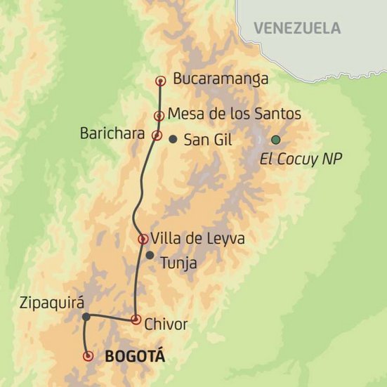 Besuch einer Smaragdmine und Fahrt ins pittoreske Villa de Leyva. Am nächsten Tag Spaziergang durch den kolonialen Ort mit seinen kopfsteingepflasterten Strassen und weiss getünchten Häusern. Sie besichtigen weiter ein Dominikaner-Kloster mitten in einer trockenen Kakteen-Landschaft sowie die archäologische Stätte El Infiernito (die kleine Hölle).